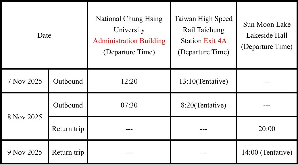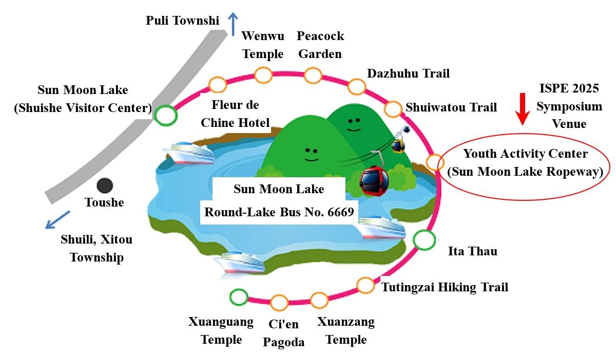 Guide to Sun Moon Lake Youth Activity Center: Click me Option 3: By using our free shuttle bus service. Pick-up location is at Taichung High Speed Rail Statio or National Chung Hsing University. The ISPE 2025 reception is at Sun Moon Lake Youth Activity Center